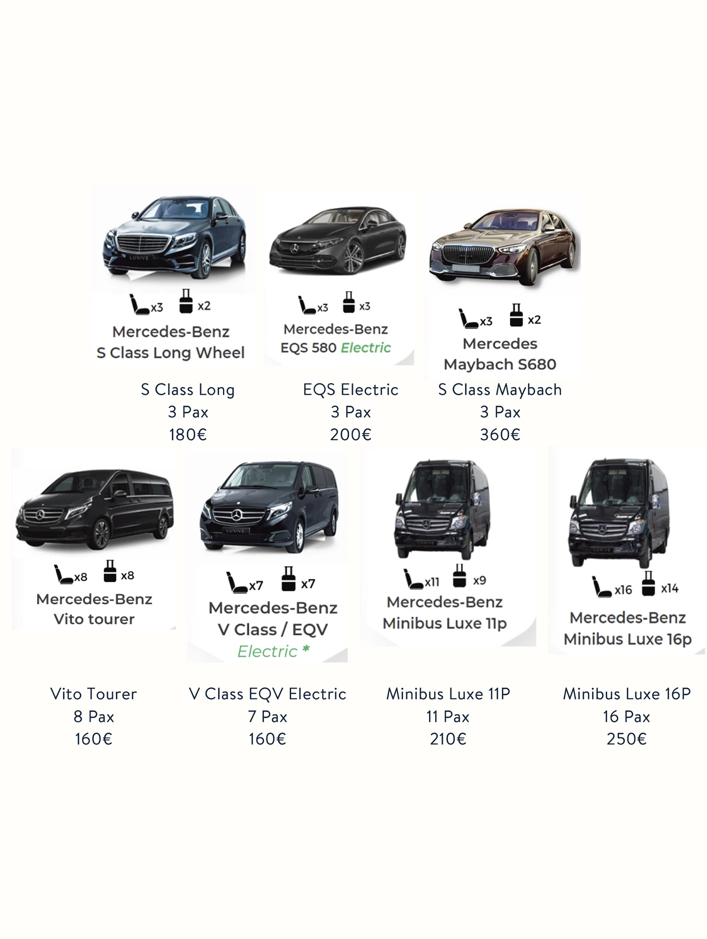 *For bookings made less than 24 hours in advance, transfer rates increase by €10 per vehicle, except for the two minibuses, which increase by €20.